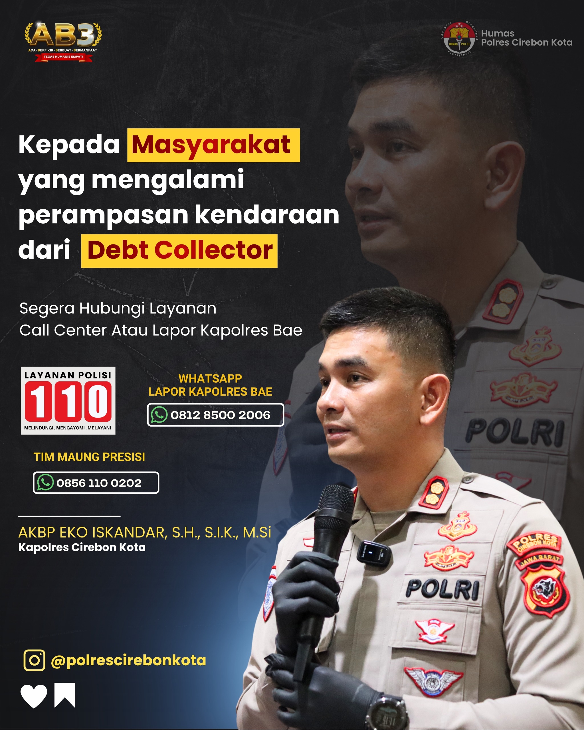 Kapolres Cirebon Kota, AKBP Eko Iskandar, S.H., S.I.K., M.Si., menyampaikan sikap tegas bahwa pihaknya tidak akan memberikan toleransi terhadap aksi penagihan oleh debt collector yang melampaui batas kewajaran dan bertentangan dengan hukum. Ia menegaskan, seluruh proses penarikan kendaraan harus mengacu pada Undang-Undang dan putusan pengadilan, bukan dilakukan melalui cara-cara paksa yang merugikan dan menimbulkan keresahan.
