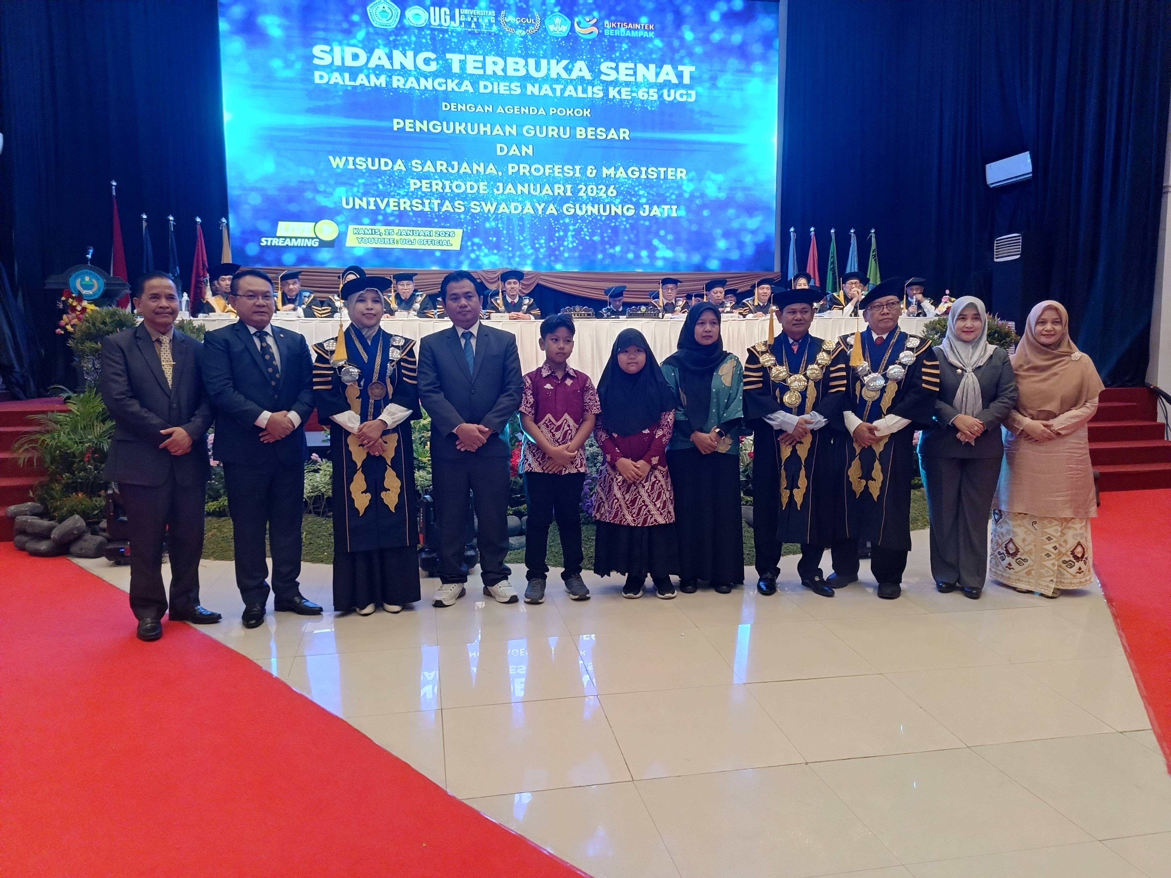 CIREBONWARTANEWSCOM, Cirebon – Universitas Swadaya Gunung Jati (UGJ) Cirebon menggelar Sidang Terbuka Senat dalam rangka Dies Natalis ke-65 dengan agenda utama Pengukuhan Guru Besar dan Wisuda Sarjana, Profesi, serta Magister Periode Januari 2026 di Auditorium UGJ, Jl. Pemuda, Kota Cirebon, Kamis (15/1/25).